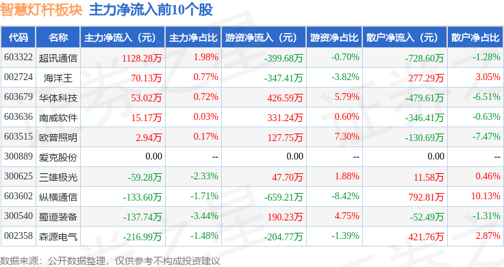 从资金流向上来看,当日智慧灯杆板块主力资金净流出10.4亿元,游资资金净流入4055.23万元,散户资金净流入10.0亿元。智慧灯杆板块个股资金流向见下表: