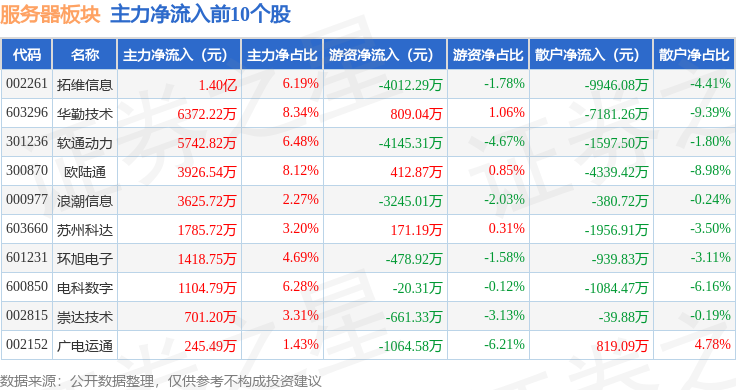 从资金流向上来看,当日服务器板块主力资金净流出16.7亿元,游资资金净流入9593.07万元,散户资金净流入15.74亿元。服务器板块个股资金流向见下表: