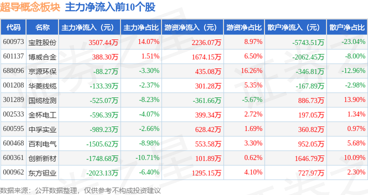 从资金流向上来看,当日超导概念板块主力资金净流出9.92亿元,游资资金净流入3.67亿元,散户资金净流入6.25亿元。超导概念板块个股资金流向见下表: