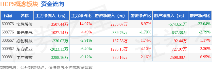 从资金流向上来看,当日HEPS概念板块主力资金净流出1006.73万元,游资资金净流入4059.2万元,散户资金净流出3052.47万元。HEPS概念板块个股资金流向见下表: