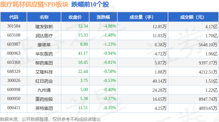 证券之星消息,11月20日医疗耗材供应链SPD板块较上一交易日下跌0.06%,建发致新领跌。当日上证指数报收于3931.05,下跌0.4%。深证成指报收于12980.82,下跌0.76%。医疗耗材供应链SPD板块个股涨跌见下表: