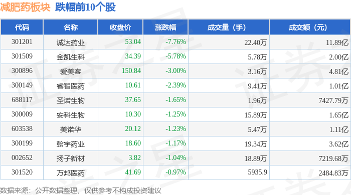 证券之星消息,11月20日减肥药板块较上一交易日下跌0.44%,诚达药业领跌。当日上证指数报收于3931.05,下跌0.4%。深证成指报收于12980.82,下跌0.76%。减肥药板块个股涨跌见下表: