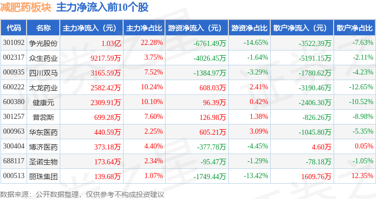 从资金流向上来看,当日减肥药板块主力资金净流出5.58亿元,游资资金净流出4331.38万元,散户资金净流入6.01亿元。减肥药板块个股资金流向见下表: