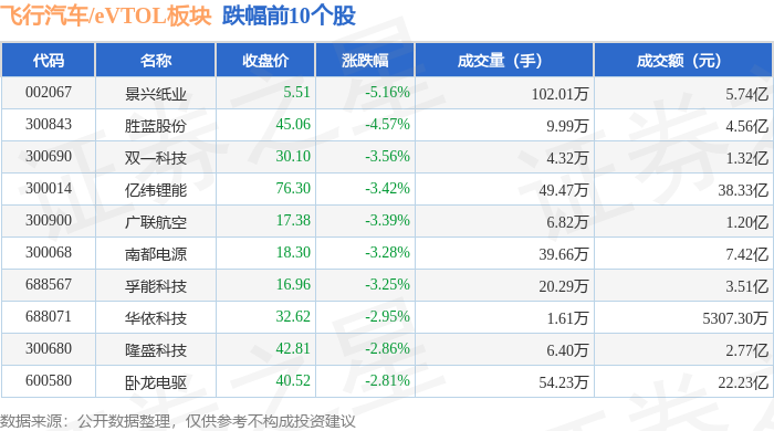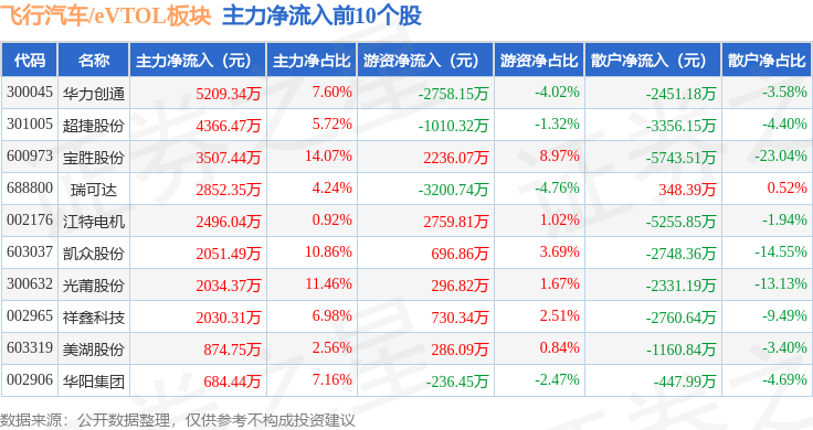 从资金流向上来看,当日飞行汽车/eVTOL板块主力资金净流出20.27亿元,游资资金净流入8447.71万元,散户资金净流入19.43亿元。飞行汽车/eVTOL板块个股资金流向见下表: