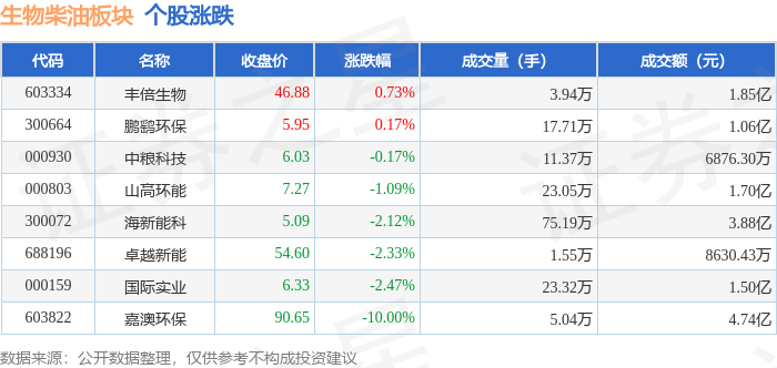 证券之星消息,11月20日生物柴油板块较上一交易日下跌2.59%,嘉澳环保领跌。当日上证指数报收于3931.05,下跌0.4%。深证成指报收于12980.82,下跌0.76%。生物柴油板块个股涨跌见下表: