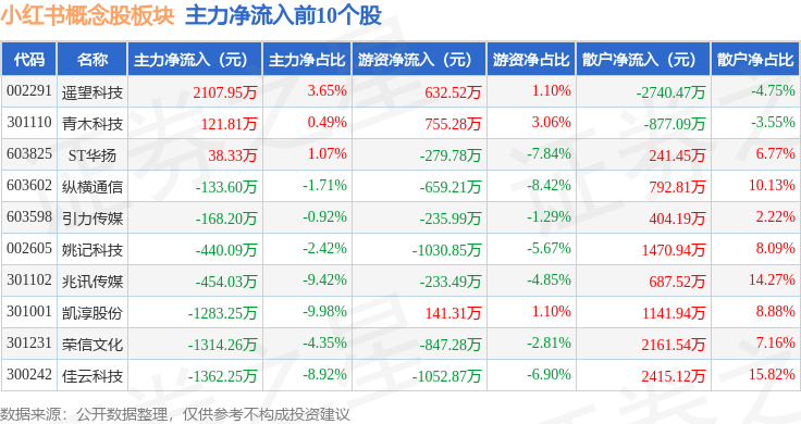从资金流向上来看,当日小红书概念股板块主力资金净流出15.41亿元,游资资金净流入5237.47万元,散户资金净流入14.89亿元。小红书概念股板块个股资金流向见下表: