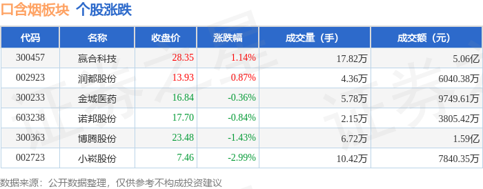 证券之星消息,11月20日口含烟板块较上一交易日下跌0.12%,小崧股份领跌。当日上证指数报收于3931.05,下跌0.4%。深证成指报收于12980.82,下跌0.76%。口含烟板块个股涨跌见下表: