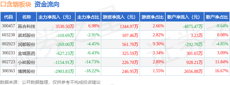 从资金流向上来看,当日口含烟板块主力资金净流出1535.16万元,游资资金净流入2813.36万元,散户资金净流出1278.2万元。口含烟板块个股资金流向见下表: