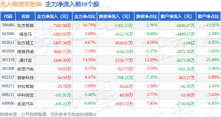 从资金流向上来看,当日无人物流车板块主力资金净流出2596.38万元,游资资金净流入9337.75万元,散户资金净流出6741.37万元。无人物流车板块个股资金流向见下表: