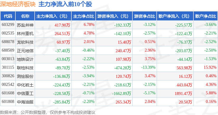 从资金流向上来看,当日深地经济板块主力资金净流出5.21亿元,游资资金净流出1.35亿元,散户资金净流入6.56亿元。深地经济板块个股资金流向见下表: