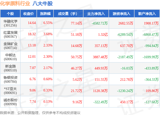 个股表现方面,化学原料行业当日领涨股为华融化学(301256),该股当日报收14.64,上涨6.55%,成交量77.14万,主力资金净流出4582.72万元。红星发展(600367)以上涨3.68%紧随其后,该股当日成交量51.18万,主力资金净流入1.32亿元。除此之外,金瑞矿业(600714)、中毅达(600610)、新金路(000510)均进入当日牛股之列。具体个股列表见下表: