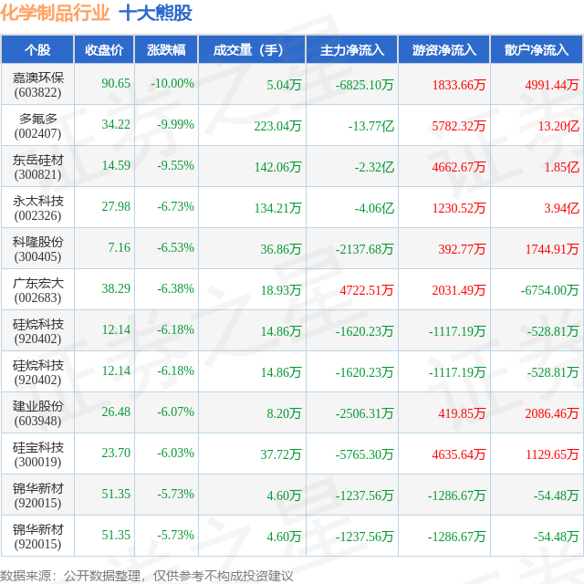 个股表现方面,化学制品行业当日领跌股为嘉澳环保(603822),该股当日报收90.65,下跌10.0%,成交量5.04万,主力资金净流出6825.1万元。多氟多(002407)以下跌9.99%紧随其后,该股当日成交量223.04万,主力资金净流出13.77亿元。除此之外,东岳硅材(300821)、永太科技(002326)、科隆股份(300405)均进入当日熊股之列。具体个股列表见下表: