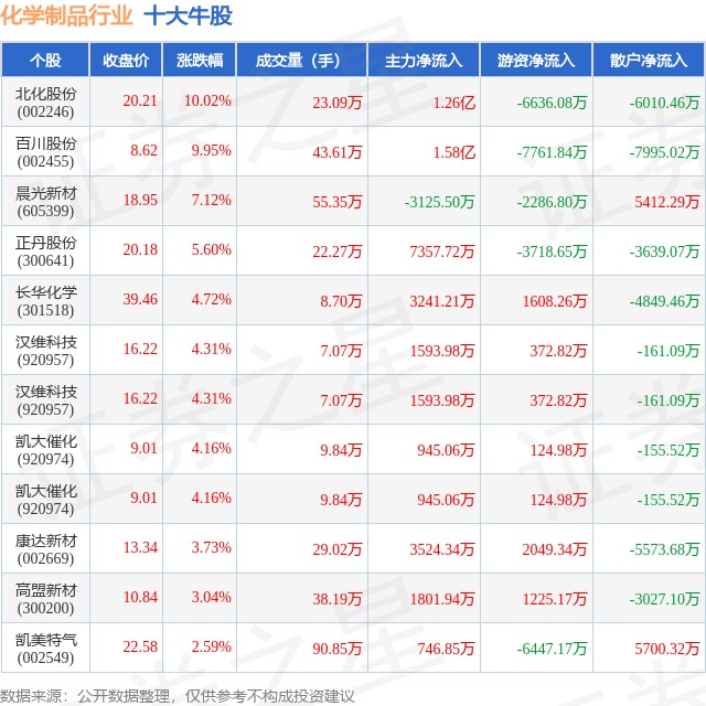 个股表现方面,化学制品行业当日领涨股为北化股份(002246),该股当日报收20.21,上涨10.02%,成交量23.09万,主力资金净流入1.26亿元。百川股份(002455)以上涨9.95%紧随其后,该股当日成交量43.61万,主力资金净流入1.58亿元。除此之外,晨光新材(605399)、正丹股份(300641)、长华化学(301518)均进入当日牛股之列。具体个股列表见下表: