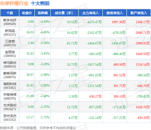 个股表现方面,化学纤维行业当日领跌股为新乡化纤(000949),该股当日报收4.89,下跌4.49%,成交量59.55万,主力资金净流出4275.47万元。新凤鸣(603225)以下跌4.45%紧随其后,该股当日成交量16.82万,主力资金净流出2162.47万元。除此之外,三房巷(600370)、宝丽迪(300905)、神马股份(600810)均进入当日熊股之列。具体个股列表见下表: