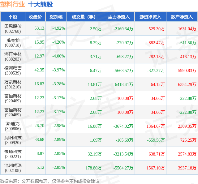 个股表现方面,塑料行业当日领跌股为国恩股份(002768),该股当日报收53.13,下跌4.92%,成交量2.5万,主力资金净流出2160.34万元。唯赛勃(688718)以下跌4.26%紧随其后,该股当日成交量8.29万,主力资金净流出270.97万元。除此之外,海正生材(688203)、横河精密(300539)、万凯新材(301216)均进入当日熊股之列。具体个股列表见下表: