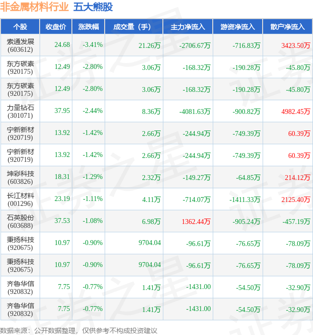 个股表现方面,非金属材料行业当日领跌股为索通发展(603612),该股当日报收24.68,下跌3.41%,成交量21.26万,主力资金净流出2706.67万元。东方碳素(920175)以下跌2.8%紧随其后,该股当日成交量3.06万,主力资金净流出168.32万元。除此之外,东方碳素(920175)、力量钻石(301071)、宁新新材(920719)均进入当日熊股之列。具体个股列表见下表: