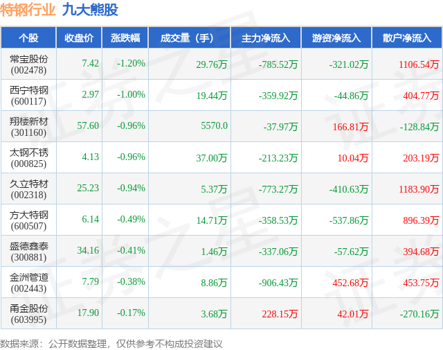 个股表现方面,特钢行业当日领跌股为常宝股份(002478),该股当日报收7.42,下跌1.2%,成交量29.76万,主力资金净流出785.52万元。西宁特钢(600117)以下跌1.0%紧随其后,该股当日成交量19.44万,主力资金净流出359.92万元。除此之外,翔楼新材(301160)、太钢不锈(000825)、久立特材(002318)均进入当日熊股之列。具体个股列表见下表: