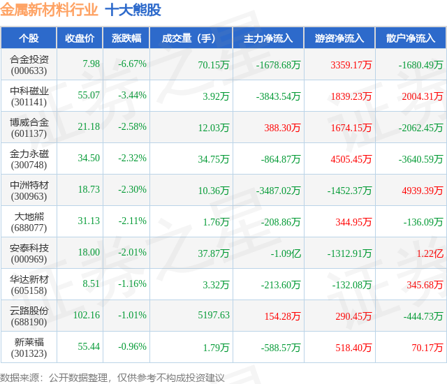 个股表现方面,金属新材料行业当日领跌股为合金投资(000633),该股当日报收7.98,下跌6.67%,成交量70.15万,主力资金净流出1678.68万元。中科磁业(301141)以下跌3.44%紧随其后,该股当日成交量3.92万,主力资金净流出3843.54万元。除此之外,博威合金(601137)、金力永磁(300748)、中洲特材(300963)均进入当日熊股之列。具体个股列表见下表: