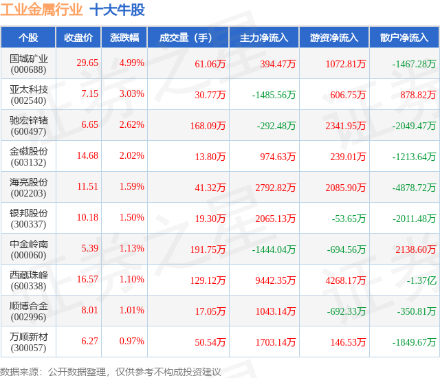 个股表现方面,工业金属行业当日领涨股为国城矿业(000688),该股当日报收29.65,上涨4.99%,成交量61.06万,主力资金净流入394.47万元。亚太科技(002540)以上涨3.03%紧随其后,该股当日成交量30.77万,主力资金净流出1485.56万元。除此之外,驰宏锌锗(600497)、金徽股份(603132)、海亮股份(002203)均进入当日牛股之列。具体个股列表见下表: