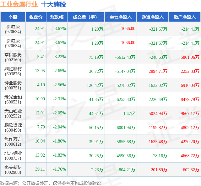 个股表现方面,工业金属行业当日领跌股为新威凌(920634),该股当日报收24.91,下跌3.67%,成交量1.29万,主力资金净流入0.11万元。新威凌(920634)以下跌3.67%紧随其后,该股当日成交量1.29万,主力资金净流入0.11万元。除此之外,常铝股份(002160)、鼎胜新材(603876)、锌业股份(000751)均进入当日熊股之列。具体个股列表见下表: