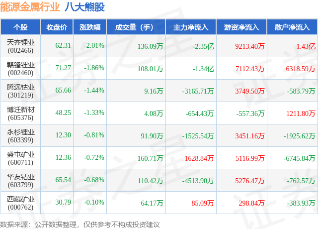 个股表现方面,能源金属行业当日领跌股为天齐锂业(002466),该股当日报收62.31,下跌2.01%,成交量136.09万,主力资金净流出2.35亿元。赣锋锂业(002460)以下跌1.86%紧随其后,该股当日成交量108.01万,主力资金净流出1.34亿元。除此之外,腾远钴业(301219)、博迁新材(605376)、永杉锂业(603399)均进入当日熊股之列。具体个股列表见下表: