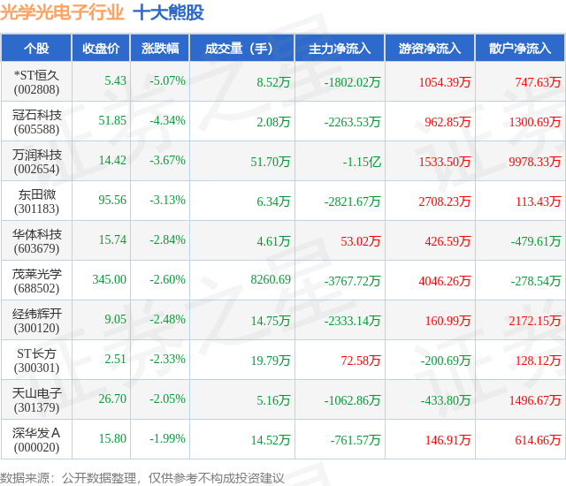 个股表现方面,光学光电子行业当日领跌股为*ST恒久(002808),该股当日报收5.43,下跌5.07%,成交量8.52万,主力资金净流出1802.02万元。冠石科技(605588)以下跌4.34%紧随其后,该股当日成交量2.08万,主力资金净流出2263.53万元。除此之外,万润科技(002654)、东田微(301183)、华体科技(603679)均进入当日熊股之列。具体个股列表见下表: