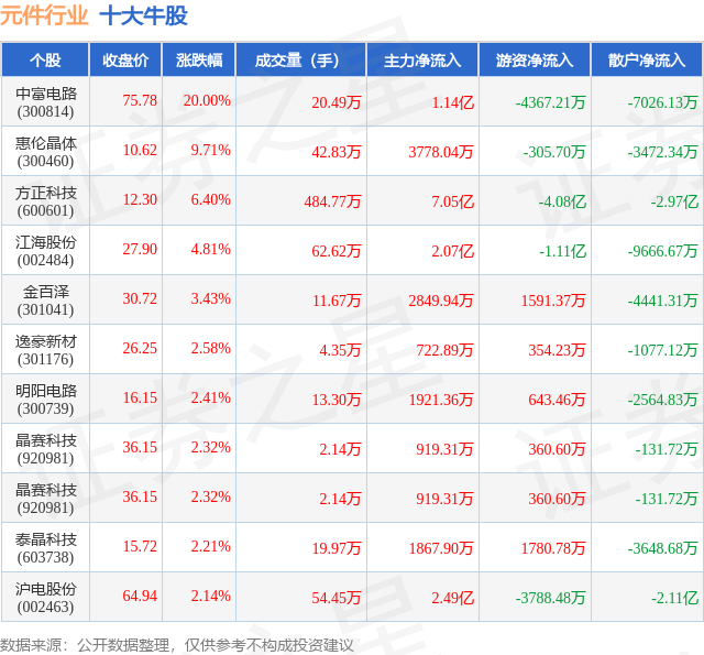 个股表现方面,元件行业当日领涨股为中富电路(300814),该股当日报收75.78,上涨20.0%,成交量20.49万,主力资金净流入1.14亿元。惠伦晶体(300460)以上涨9.71%紧随其后,该股当日成交量42.83万,主力资金净流入3778.04万元。除此之外,方正科技(600601)、江海股份(002484)、金百泽(301041)均进入当日牛股之列。具体个股列表见下表: