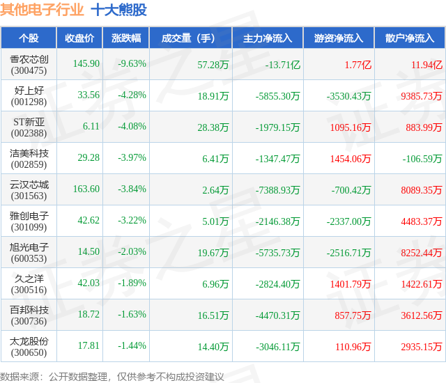 个股表现方面,其他电子行业当日领跌股为香农芯创(300475),该股当日报收145.9,下跌9.63%,成交量57.28万,主力资金净流出13.71亿元。好上好(001298)以下跌4.28%紧随其后,该股当日成交量18.91万,主力资金净流出5855.3万元。除此之外,ST新亚(002388)、洁美科技(002859)、云汉芯城(301563)均进入当日熊股之列。具体个股列表见下表: