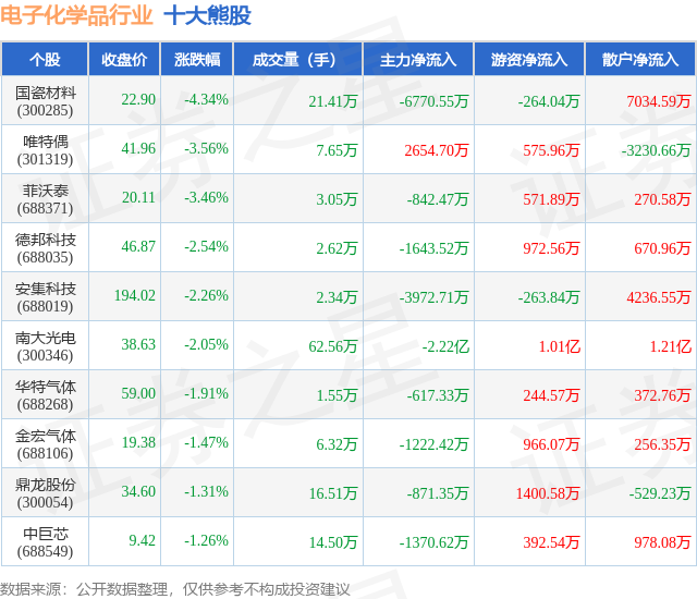 个股表现方面,电子化学品行业当日领跌股为国瓷材料(300285),该股当日报收22.9,下跌4.34%,成交量21.41万,主力资金净流出6770.55万元。唯特偶(301319)以下跌3.56%紧随其后,该股当日成交量7.65万,主力资金净流入2654.7万元。除此之外,菲沃泰(688371)、德邦科技(688035)、安集科技(688019)均进入当日熊股之列。具体个股列表见下表: