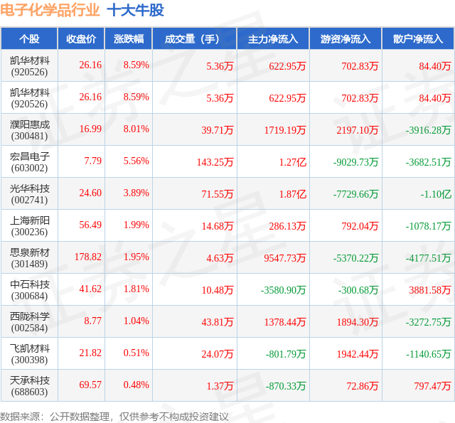 个股表现方面,电子化学品行业当日领涨股为凯华材料(920526),该股当日报收26.16,上涨8.59%,成交量5.36万,主力资金净流入622.95万元。凯华材料(920526)以上涨8.59%紧随其后,该股当日成交量5.36万,主力资金净流入622.95万元。除此之外,濮阳惠成(300481)、宏昌电子(603002)、光华科技(002741)均进入当日牛股之列。具体个股列表见下表: