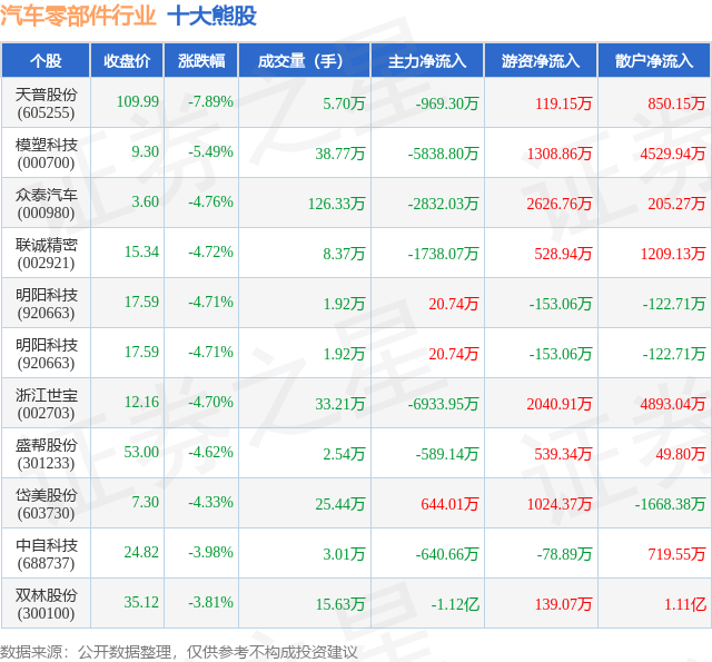 个股表现方面,汽车零部件行业当日领跌股为天普股份(605255),该股当日报收109.99,下跌7.89%,成交量5.7万,主力资金净流出969.3万元。模塑科技(000700)以下跌5.49%紧随其后,该股当日成交量38.77万,主力资金净流出5838.8万元。除此之外,众泰汽车(000980)、联诚精密(002921)、明阳科技(920663)均进入当日熊股之列。具体个股列表见下表: