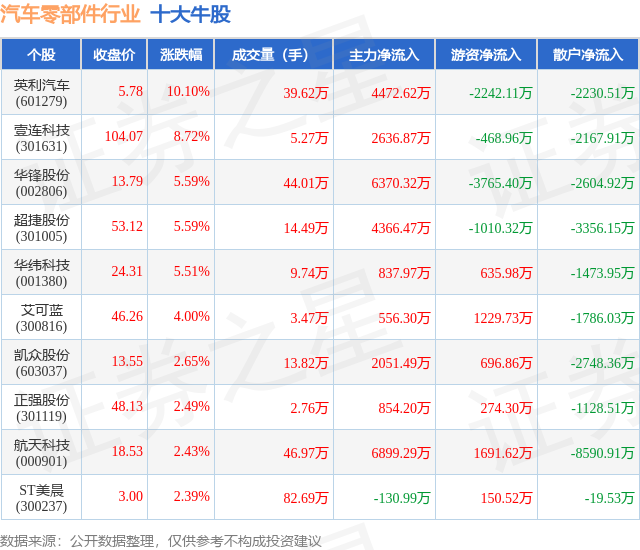 个股表现方面,汽车零部件行业当日领涨股为英利汽车(601279),该股当日报收5.78,上涨10.1%,成交量39.62万,主力资金净流入4472.62万元。壹连科技(301631)以上涨8.72%紧随其后,该股当日成交量5.27万,主力资金净流入2636.87万元。除此之外,华锋股份(002806)、超捷股份(301005)、华纬科技(001380)均进入当日牛股之列。具体个股列表见下表: