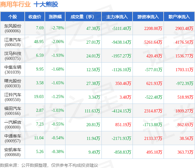 个股表现方面,商用车行业当日领跌股为东风股份(600006),该股当日报收7.69,下跌2.78%,成交量47.38万,主力资金净流出5111.48万元。江淮汽车(600418)以下跌2.06%紧随其后,该股当日成交量27.01万,主力资金净流出9438.14万元。除此之外,汉马科技(600375)、中集车辆(301039)、曙光股份(600303)均进入当日熊股之列。具体个股列表见下表: