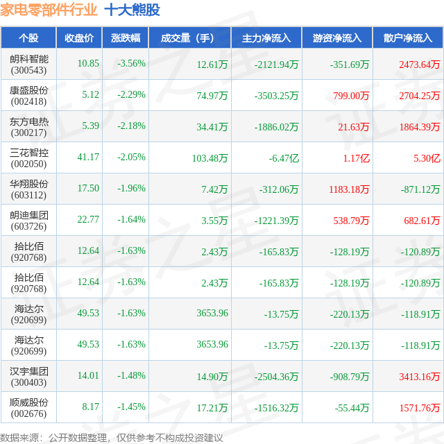 个股表现方面,家电零部件行业当日领跌股为朗科智能(300543),该股当日报收10.85,下跌3.56%,成交量12.61万,主力资金净流出2121.94万元。康盛股份(002418)以下跌2.29%紧随其后,该股当日成交量74.97万,主力资金净流出3503.25万元。除此之外,东方电热(300217)、三花智控(002050)、华翔股份(603112)均进入当日熊股之列。具体个股列表见下表: