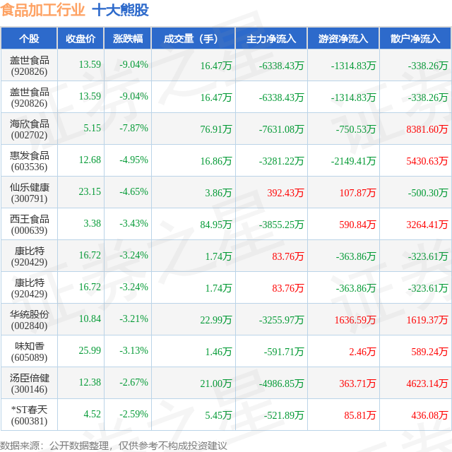个股表现方面,食品加工行业当日领跌股为盖世食品(920826),该股当日报收13.59,下跌9.04%,成交量16.47万,主力资金净流出6338.43万元。盖世食品(920826)以下跌9.04%紧随其后,该股当日成交量16.47万,主力资金净流出6338.43万元。除此之外,海欣食品(002702)、惠发食品(603536)、仙乐健康(300791)均进入当日熊股之列。具体个股列表见下表: