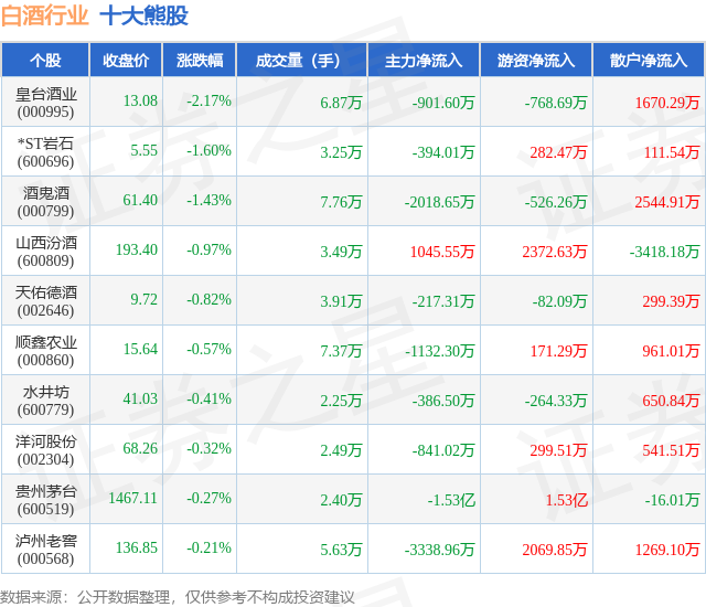 个股表现方面,白酒行业当日领跌股为皇台酒业(000995),该股当日报收13.08,下跌2.17%,成交量6.87万,主力资金净流出901.6万元。*ST岩石(600696)以下跌1.6%紧随其后,该股当日成交量3.25万,主力资金净流出394.01万元。除此之外,酒鬼酒(000799)、山西汾酒(600809)、天佑德酒(002646)均进入当日熊股之列。具体个股列表见下表: