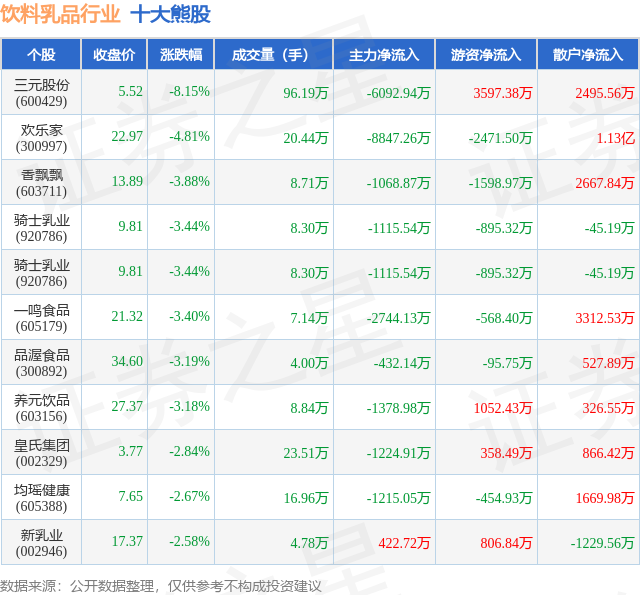 个股表现方面,饮料乳品行业当日领跌股为三元股份(600429),该股当日报收5.52,下跌8.15%,成交量96.19万,主力资金净流出6092.94万元。欢乐家(300997)以下跌4.81%紧随其后,该股当日成交量20.44万,主力资金净流出8847.26万元。除此之外,香飘飘(603711)、骑士乳业(920786)、骑士乳业(920786)均进入当日熊股之列。具体个股列表见下表: