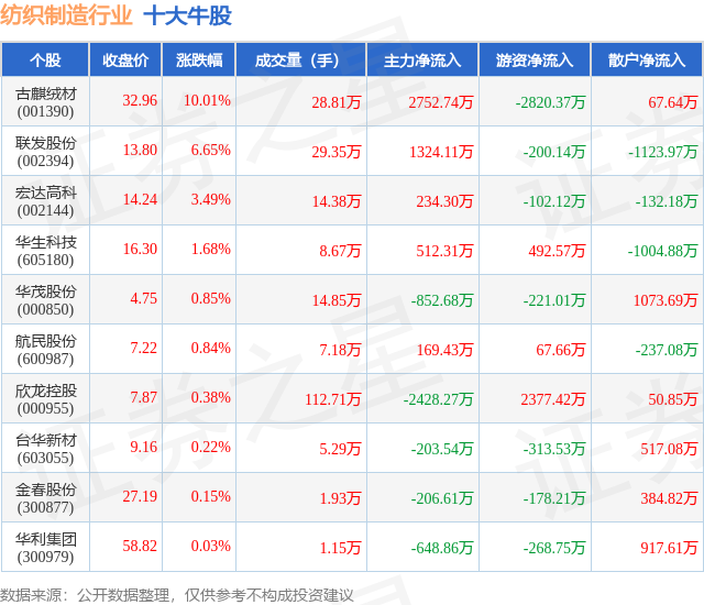 个股表现方面,纺织制造行业当日领涨股为古麒绒材(001390),该股当日报收32.96,上涨10.01%,成交量28.81万,主力资金净流入2752.74万元。联发股份(002394)以上涨6.65%紧随其后,该股当日成交量29.35万,主力资金净流入1324.11万元。除此之外,宏达高科(002144)、华生科技(605180)、华茂股份(000850)均进入当日牛股之列。具体个股列表见下表: