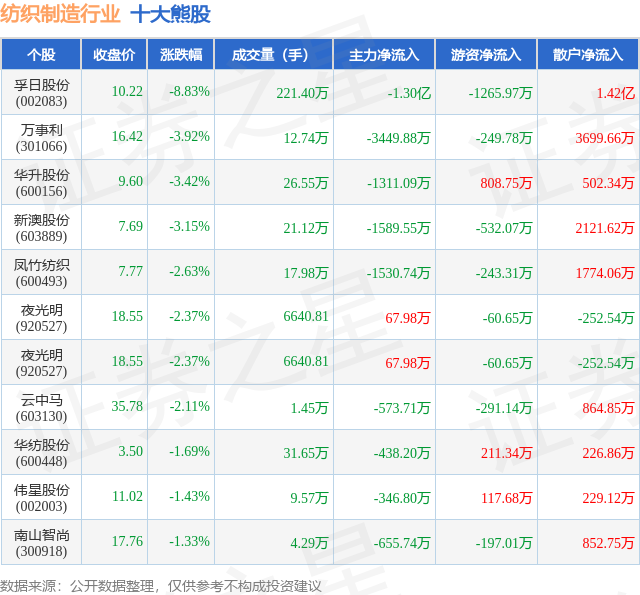 个股表现方面,纺织制造行业当日领跌股为孚日股份(002083),该股当日报收10.22,下跌8.83%,成交量221.4万,主力资金净流出1.3亿元。万事利(301066)以下跌3.92%紧随其后,该股当日成交量12.74万,主力资金净流出3449.88万元。除此之外,华升股份(600156)、新澳股份(603889)、凤竹纺织(600493)均进入当日熊股之列。具体个股列表见下表: