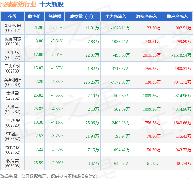 个股表现方面,服装家纺行业当日领跌股为朗姿股份(002612),该股当日报收21.96,下跌7.11%,成交量41.91万,主力资金净流出1026.11万元。奥康国际(603001)以下跌5.64%紧随其后,该股当日成交量7.83万,主力资金净流出1038.41万元。除此之外,太平鸟(603877)、三夫户外(002780)、美邦服饰(002269)均进入当日熊股之列。具体个股列表见下表: