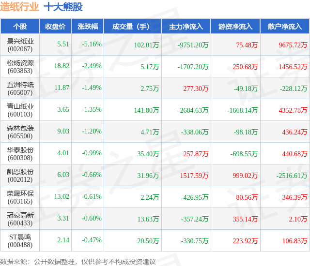 个股表现方面,造纸行业当日领跌股为景兴纸业(002067),该股当日报收5.51,下跌5.16%,成交量102.01万,主力资金净流出9751.2万元。松炀资源(603863)以下跌2.49%紧随其后,该股当日成交量5.17万,主力资金净流出1707.2万元。除此之外,五洲特纸(605007)、青山纸业(600103)、森林包装(605500)均进入当日熊股之列。具体个股列表见下表: