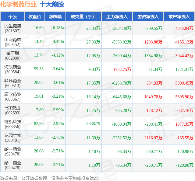 个股表现方面,化学制药行业当日领跌股为民生健康(301507),该股当日报收16.69,下跌6.18%,成交量27.34万,主力资金净流出3634.49万元。山河药辅(300452)以下跌4.45%紧随其后,该股当日成交量27.33万,主力资金净流出5359.02万元。除此之外,哈三联(002900)、海辰药业(300584)、联环药业(600513)均进入当日熊股之列。具体个股列表见下表: