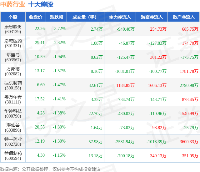 个股表现方面,中药行业当日领跌股为康惠股份(603139),该股当日报收22.26,下跌3.72%,成交量2.74万,主力资金净流出940.48万元。恩威医药(301331)以下跌2.32%紧随其后,该股当日成交量1.08万,主力资金净流出46.87万元。除此之外,珍宝岛(603567)、万邦德(002082)、振东制药(300158)均进入当日熊股之列。具体个股列表见下表:
