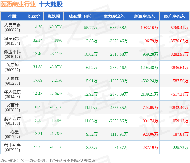 个股表现方面,医药商业行业当日领跌股为人民同泰(600829),该股当日报收14.36,下跌9.97%,成交量55.77万,主力资金净流出6852.58万元。建发致新(301584)以下跌4.88%紧随其后,该股当日成交量12.85万,主力资金净流出3673.46万元。除此之外,漱玉平民(301017)、药易购(300937)、大参林(603233)均进入当日熊股之列。具体个股列表见下表: