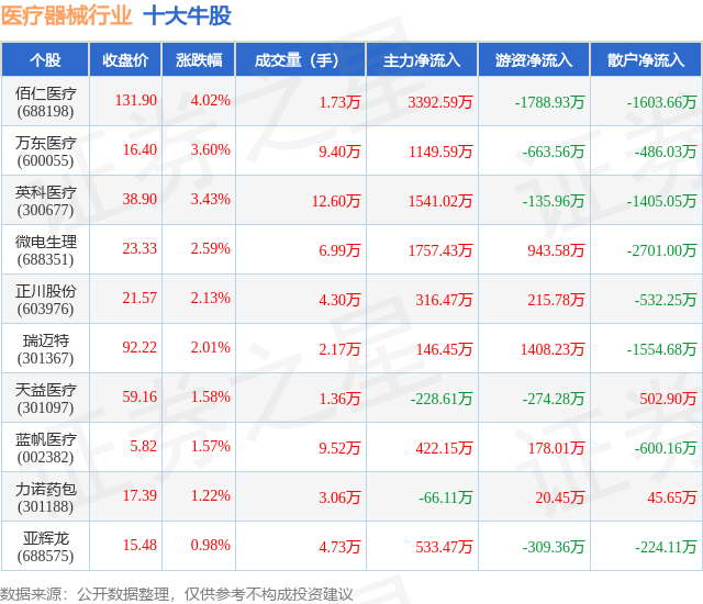 个股表现方面,医疗器械行业当日领涨股为佰仁医疗(688198),该股当日报收131.9,上涨4.02%,成交量1.73万,主力资金净流入3392.59万元。万东医疗(600055)以上涨3.6%紧随其后,该股当日成交量9.4万,主力资金净流入1149.59万元。除此之外,英科医疗(300677)、微电生理(688351)、正川股份(603976)均进入当日牛股之列。具体个股列表见下表: