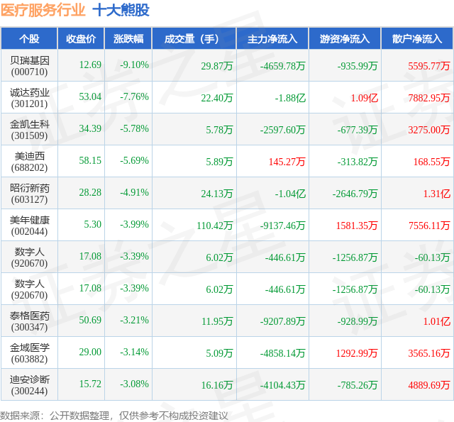 个股表现方面,医疗服务行业当日领跌股为贝瑞基因(000710),该股当日报收12.69,下跌9.1%,成交量29.87万,主力资金净流出4659.78万元。诚达药业(301201)以下跌7.76%紧随其后,该股当日成交量22.4万,主力资金净流出1.88亿元。除此之外,金凯生科(301509)、美迪西(688202)、昭衍新药(603127)均进入当日熊股之列。具体个股列表见下表: