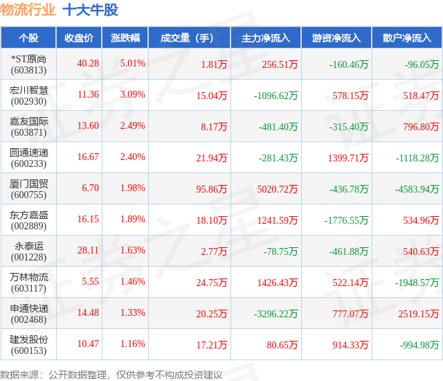 个股表现方面,物流行业当日领涨股为*ST原尚(603813),该股当日报收40.28,上涨5.01%,成交量1.81万,主力资金净流入256.51万元。宏川智慧(002930)以上涨3.09%紧随其后,该股当日成交量15.04万,主力资金净流出1096.62万元。除此之外,嘉友国际(603871)、圆通速递(600233)、厦门国贸(600755)均进入当日牛股之列。具体个股列表见下表: