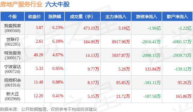 个股表现方面,房地产服务行业当日领涨股为我爱我家(000560),该股当日报收3.07,上涨6.23%,成交量473.19万,主力资金净流入3.18亿元。世联行(002285)以上涨6.1%紧随其后,该股当日成交量184.09万,主力资金净流入8917.98万元。除此之外,特发服务(300917)、宁波富达(600724)、招商积余(001914)均进入当日牛股之列。具体个股列表见下表: