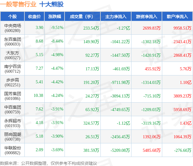 个股表现方面,一般零售行业当日领跌股为中央商场(600280),该股当日报收3.9,下跌9.51%,成交量233.54万,主力资金净流出1.27亿元。东百集团(600693)以下跌8.44%紧随其后,该股当日成交量149.9万,主力资金净流出1041.22万元。除此之外,大东方(600327)、南宁百货(600712)、步步高(002251)均进入当日熊股之列。具体个股列表见下表: