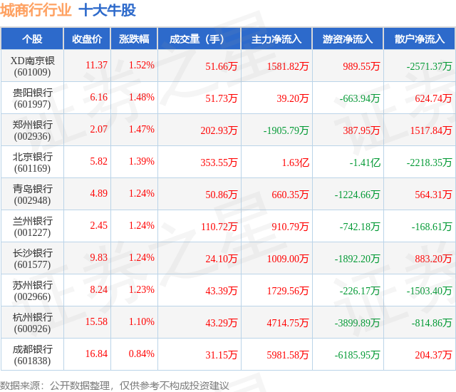 个股表现方面,城商行行业当日领涨股为XD南京银(601009),该股当日报收11.37,上涨1.52%,成交量51.66万,主力资金净流入1581.82万元。贵阳银行(601997)以上涨1.48%紧随其后,该股当日成交量51.73万,主力资金净流入39.2万元。除此之外,郑州银行(002936)、北京银行(601169)、青岛银行(002948)均进入当日牛股之列。具体个股列表见下表: